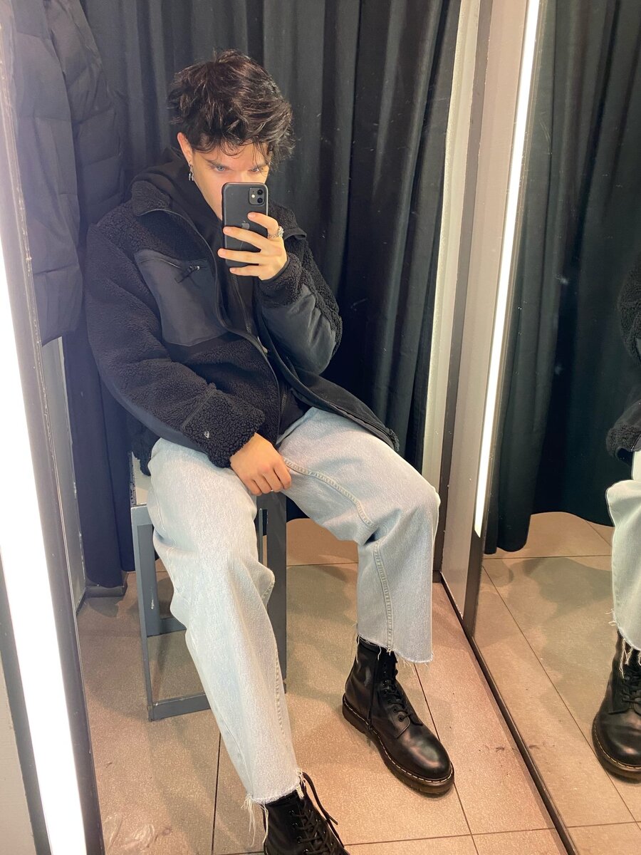 У этого паренька отличные широкие джинсы,немного укороченные,отличные ботинки,просто здоровская телогрейка,вот вам пример как стоит сочетать вещи между собой,по цветам,по формам,просто идеально,ЛАЙК! 10 из 10.