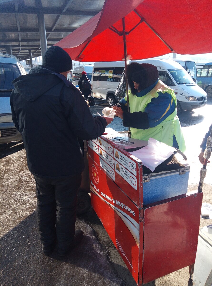 Покупаю пянсе. Продавец достает горячий с паром. По размеру он большой, как три манта.