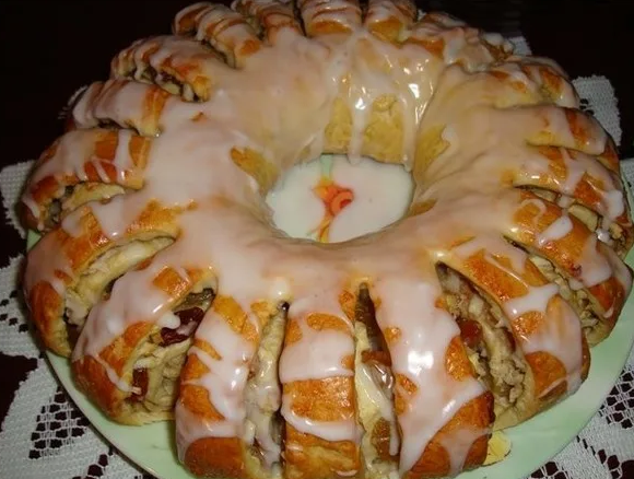 7. Спустя отведенное время ставим пирог в разогретую до 180° духовку на 20-25 мин. Не забудьте смазать взбитым яйцом для того, чтобы выпечка подрумянилась. Остужаем на решетке и поливаем глазурью. Вуаля, пирог «Веночек» с яблоками и изюмом готов.