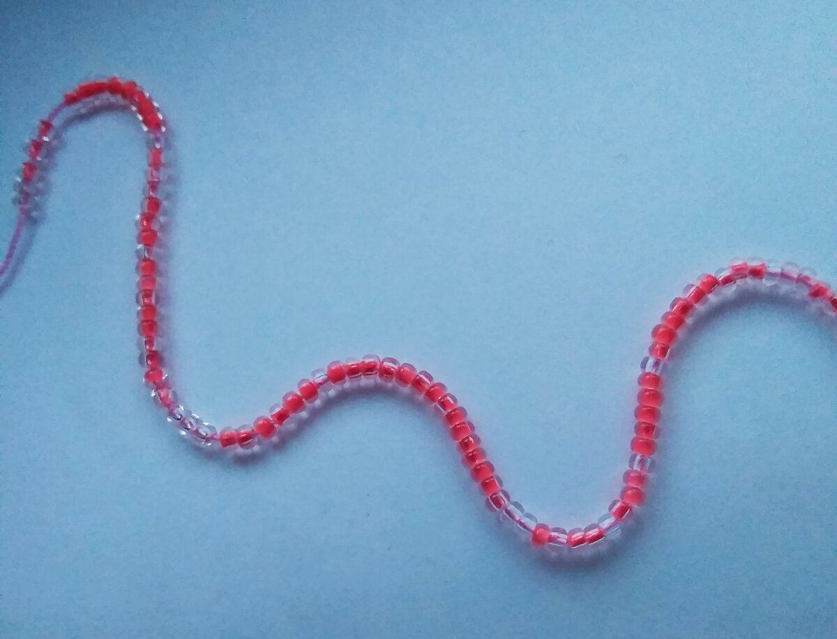 Уже на этапе нанизывания бисера на нить, была неприятно удивлена - при перегонке бисеринок цвет тоже исчезал, оставляя на нити розовый "лак". Но так как нить была тоже розового цвета я надеялась, что на конечный результат это никак не повлияет.
