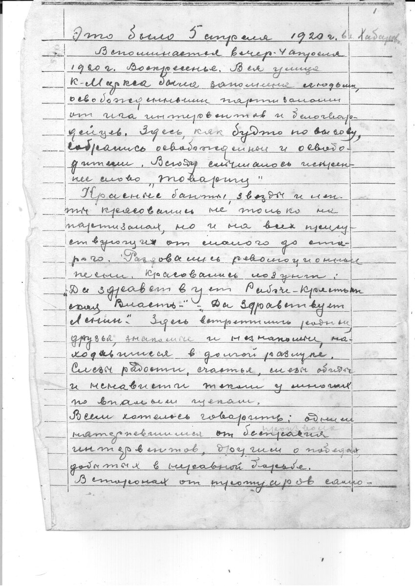 Наступление японцев на Хабаровск 5 апреля 1920г застало меня во вновь формировавшемся Советском Артполку. Расквартирован полк был между Саперной улицей и верхним рынком. Выше нас казарму занимали военморы, а рядом японцы. 4 апреля наша часть вместе с моряками ушла в гарнизонный караул на вокзал, оттуда уже никто не вернулся и я после этого никого не встречал, ни в партизанских отрядах, ни в частях НРА. Нас в полку свободных от нарядов в караул осталось человек-20 и моряков не больше. Ещё 4 апреля вечером в нашу казарму и казарму моряков заходили японцы и с притворным удовольствием, разрешали нашим товарищам прикалывать им на грудь красные бантики и звездочки, и улыбаясь, говорили: -"ИИ-Хоросо". Утром 5 апреля примерно часов в девять со стороны японцев по всему городу открылась стрельба из орудий, пулеметов и винтовок. Стреляли в основном по Штабу революционных войск и местам скопления народа.