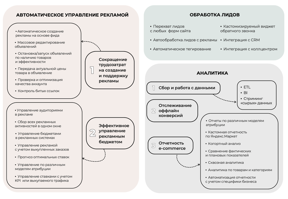 - Остановка/запуск объявлений по наличию товаров и эффективности