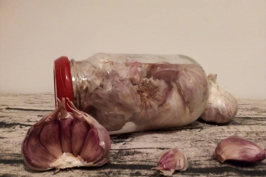 2. В чеснок насыпаем чайную ложку соли, заливаем водой. Банку закручиваем и оставляем в теплом месте на 8 недель
