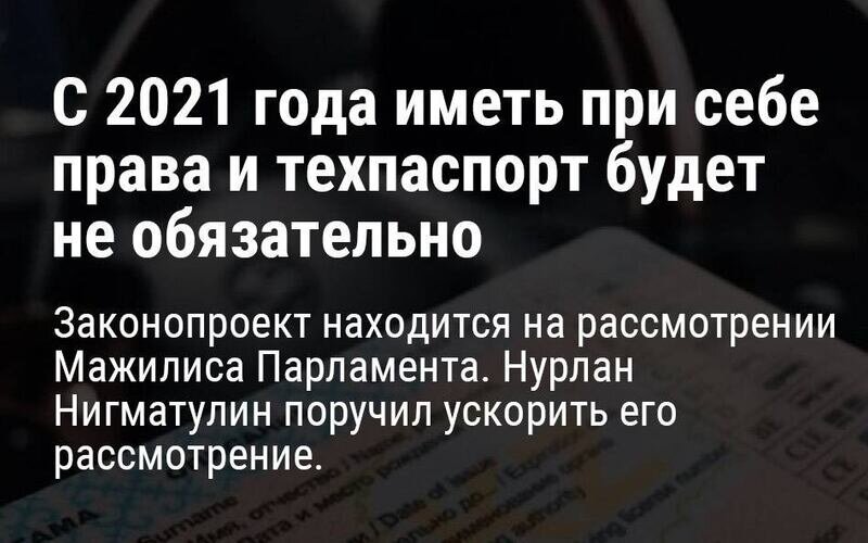 Сегодня хорошие новости. Всем известно, что в Казахстане активно ведется работа по цифровизации. И следующим шагом в ней является отмена обязательного ношения с собой прав на управления автомобилем и техпаспорта на него. В данное время законопроект уже находится на рассмотрении в мажилисе парламента. И его 100% примут, потому как об этом не раз говорил Глава государства.
