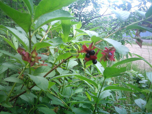 Шествовал от Сосново до дачи и будучи внимательным и наблюдательным приметил необычный куст, с пурпурными цветками и черными ягодками.