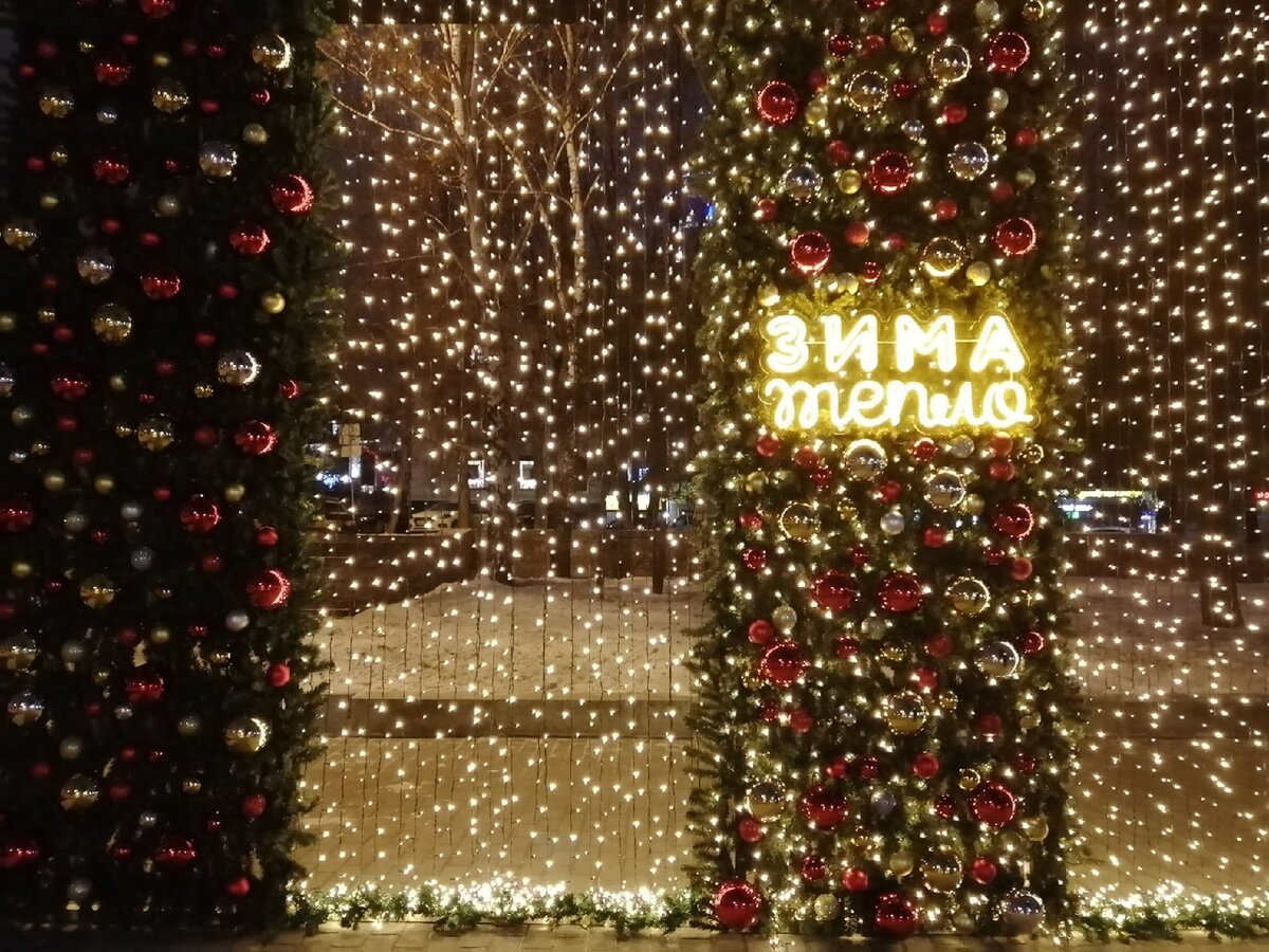 Классическое новогоднее оформление около ресторана Asado. Здесь можно сфотографироваться на фоне гирлянды или придумать что-то с перилами, которые украшены еловыми веточками.