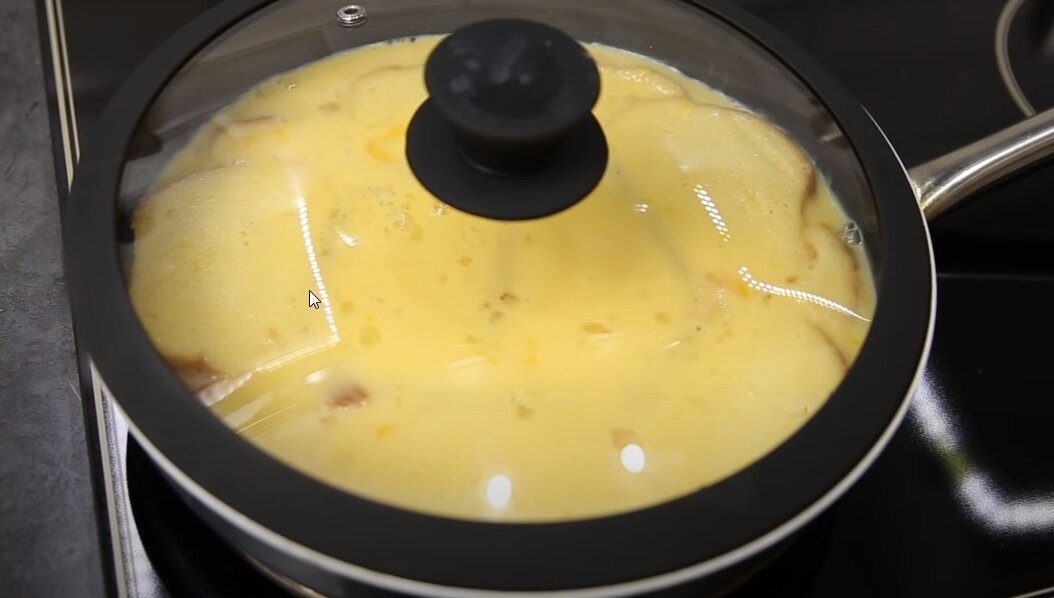 - И снова под крышку, чтобы нижний слой гренок прожарился, а сыр расплавился.