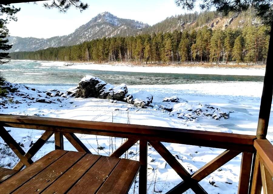 Общая зона отдыха на два номера — площадка с видом на реку Катунь, стол на 4-6 человек.