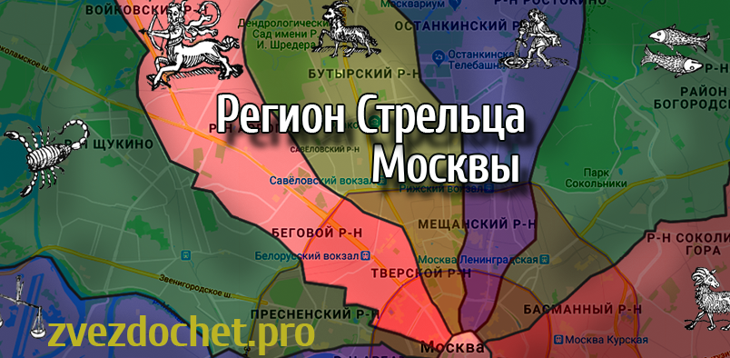 Регион Стрельца расположен на северо-западе, соседствуя на западе с беспокойным скрытным Скорпионом, а на севере с холодным расчетливым Козерогом (посмотреть координаты региона Стрельца на карте Москвы).