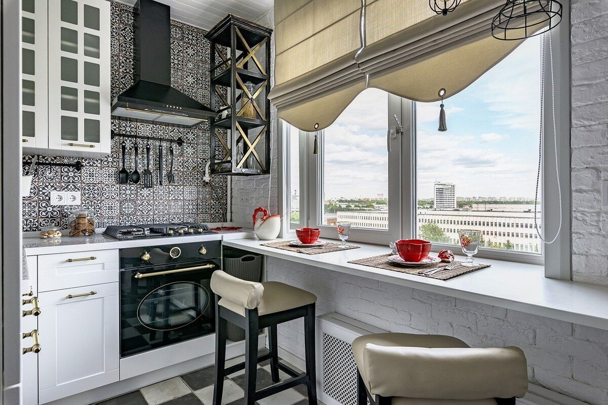 Можно также подумать о том, чтобы подоконники вовлечь в рабочее пространство. Это подойдет для тех кухонь, которые имеют малую площадь. Можно совместить подоконниками какие-нибудь рабочие поверхности или установить туда бытовую технику, приправы, различные запасы.