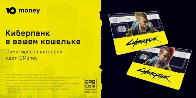 В тоже время сервис ЮMoney (раньше Яндекс.Деньги) объявляет о выпуске специальной серии пластиковых и виртуальных карт Visa с дизайном Cyberpunk 2077. Сервис выпустил такие карты совместно со студией CD Project Red и магазином игр GOG.com.