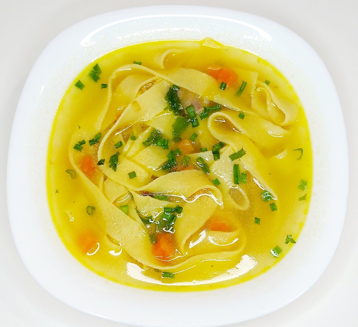 12. Вынуть мясо из бульона. Добавить лапшу, при этом постоянно нужно мешать супчик, чтобы лапша не слиплась. Варить 3 минуты и можно подавать.