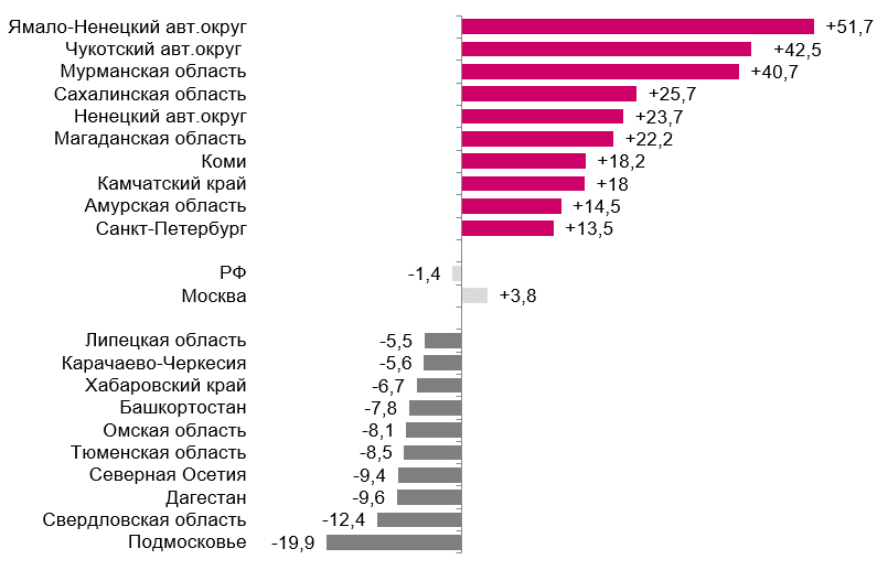 Существеннее всего номинальные денежные доходы населения выросли в традиционно богатом нефтегазовом Ямало-Ненецком автономном округе - на 51,7 тыс. руб. совокупно за девять месяцев по сравнению с аналогичным прошлогодним периодом. За ним следуют Чукотский автономный округ (+42,5 тыс. руб.), Мурманская область (+40,7 тыс. руб.), Сахалинская область (+25,7 тыс. руб.), Ненецкий автономный округ (+23,7 тыс. руб.), Магаданская область (+22,2 тыс. руб.), Республика Коми (+18,2 тыс. руб.), Камчатский край (+18 тыс. руб.), Амурская область (+14,5 тыс. руб.), замыкает десятку регионов-лидеров по росту доходов Санкт-Петербург (+13,5 тыс. руб.).