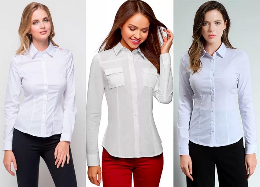 Белая рубашка, с множеством выточек, укороченная и плотно сидит по фигуре. Когда-то такой фасон был в моде, но время идет, и на смену ей пришла:
