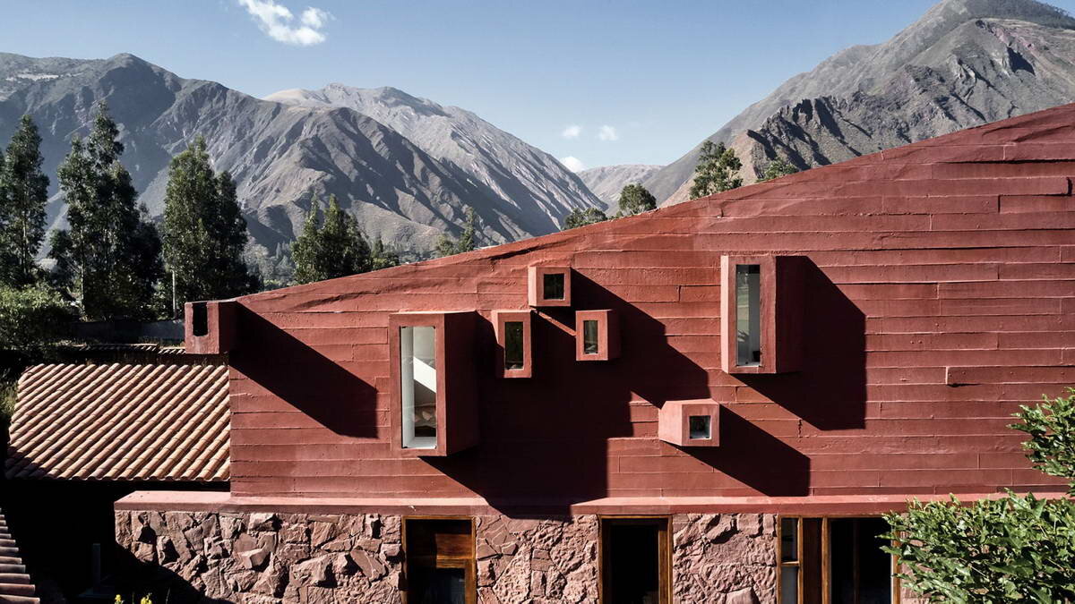 Этот дом находится в Перу в долине Урубамба в долине между горами хребта Питусирай. Как прекрасно видно на первой фотографии дом отделан двумя материалами: красный камень из местной долины покрывает крышу и нижнюю часть дома, а верхняя часть сделана из бетона с вкраплениями пуццоланового цемента, который также имеет красный оттенок. Дом имеет L-образную форму из-за патио у входа. На первом этаже расположена гостиная и столовая, а также 3 спальни. На втором этаже тоже есть спальня и большая терраса. Что интересно - для строительства дома из-за неровности почвы долины между гор пришлось довольно большой участок обработать террасами и ровной платформой. Кроме того крыша, которая покрыта камнем, днем защищает от солнечного света, а ночью отдает накопленное за день тепло дому. Ночью, знаете ли, в горах очень холодно. А если Вы хотите построить интересный дом - мы поможем Вам найти проверенного подрядчика.
