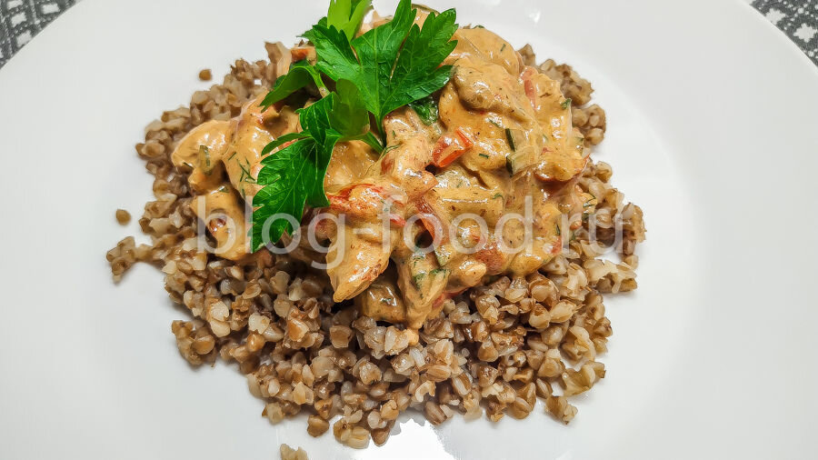 Сегодня у нас очередной вариант куриного фрикасе — в сливках с кабачком и болгарским перцем.