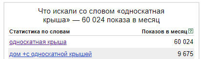 Между тем, в последнее время все чаще при возведении дома обустраивается односкатная крыша, в поисковике Яндекс имеется стабильный интерес к проектам с односкатной крышей - около 60 тысяч ежемесячных запросов: