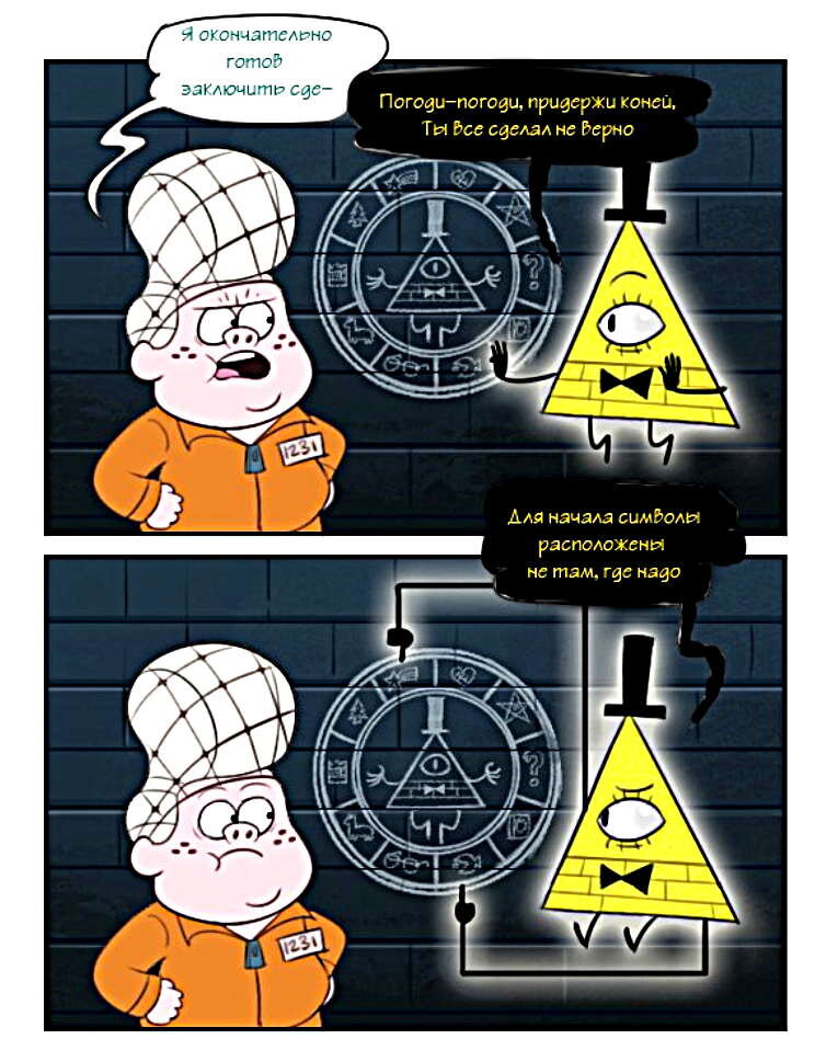 Шифр очень дотошный и даже немного занудный, когда дело касается деталей. Впрочем, это для Гидеона точность пиктограммы - мелочи. А Билл подходит к делу со всей серьёзностью.