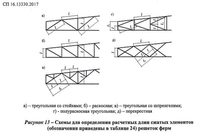 п.10.1.1 Расчётные длины сжатых элементов плоских ферм и связей в их плоскости lef и из плоскости lef,1 (рисунок 13, а), б), в), г), за исключением элементов, указанных в 10.1.2 и 10.1.3, следует принимать по таблице 24