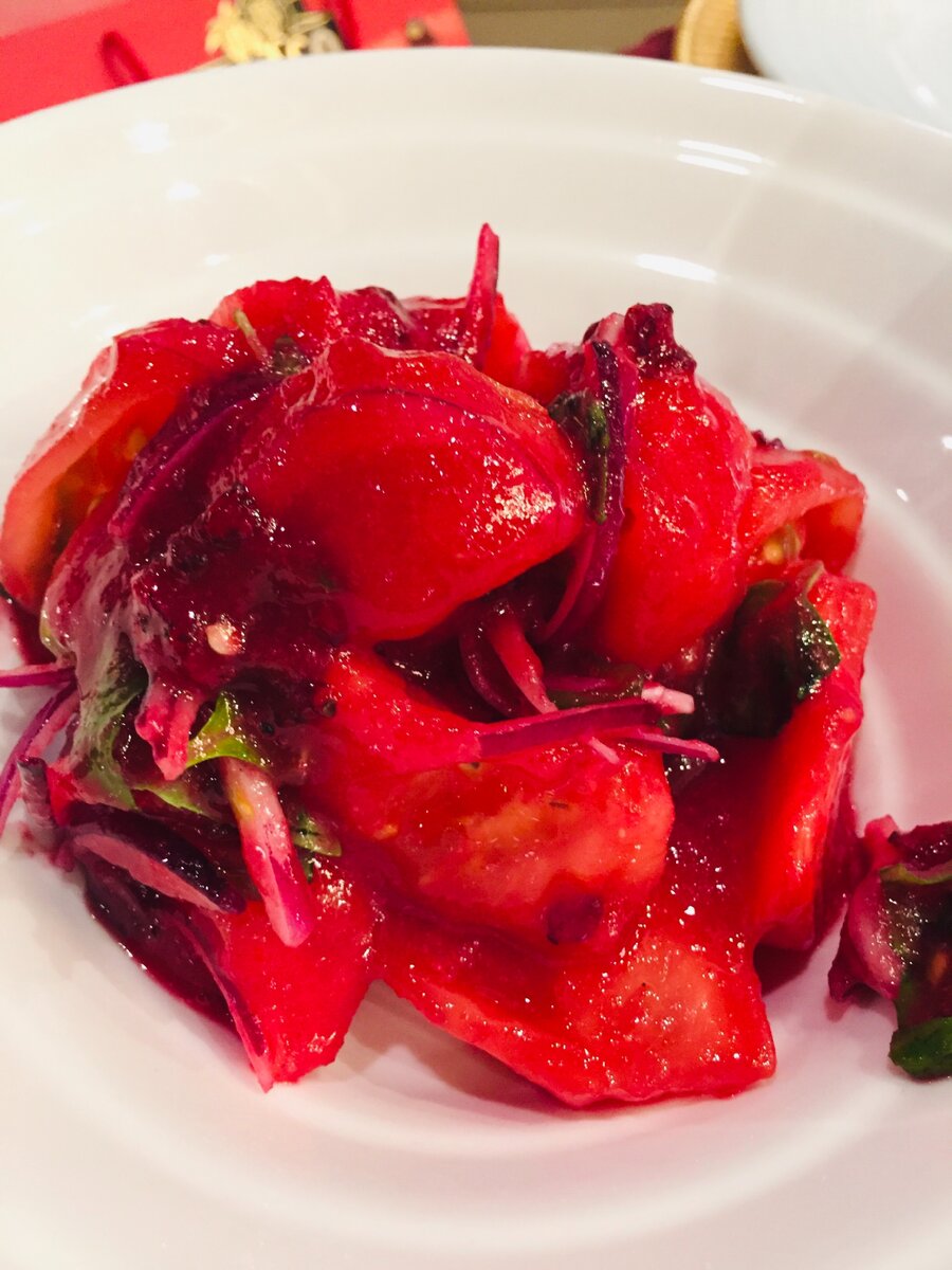 Нам понадобятся 5 маленьких помидоров, 150 грамм сушеного кизила, красная луковица, несколько листьев зеленого базилика, 50 мл оливкового масла, соль и