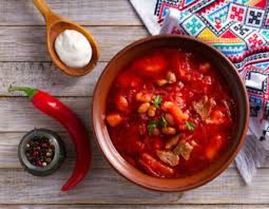 РЕЦЕПТ: Украинского борща на одну порцию: говядина 40,говяжьи кости 100, свёкла 60,капуста 80,картофель 100, морковь 20, петрушка 8, лук 35,шпик 5, свиное сало 4, сахар 5, перец болгарский 10, перец, специи по вкусу.