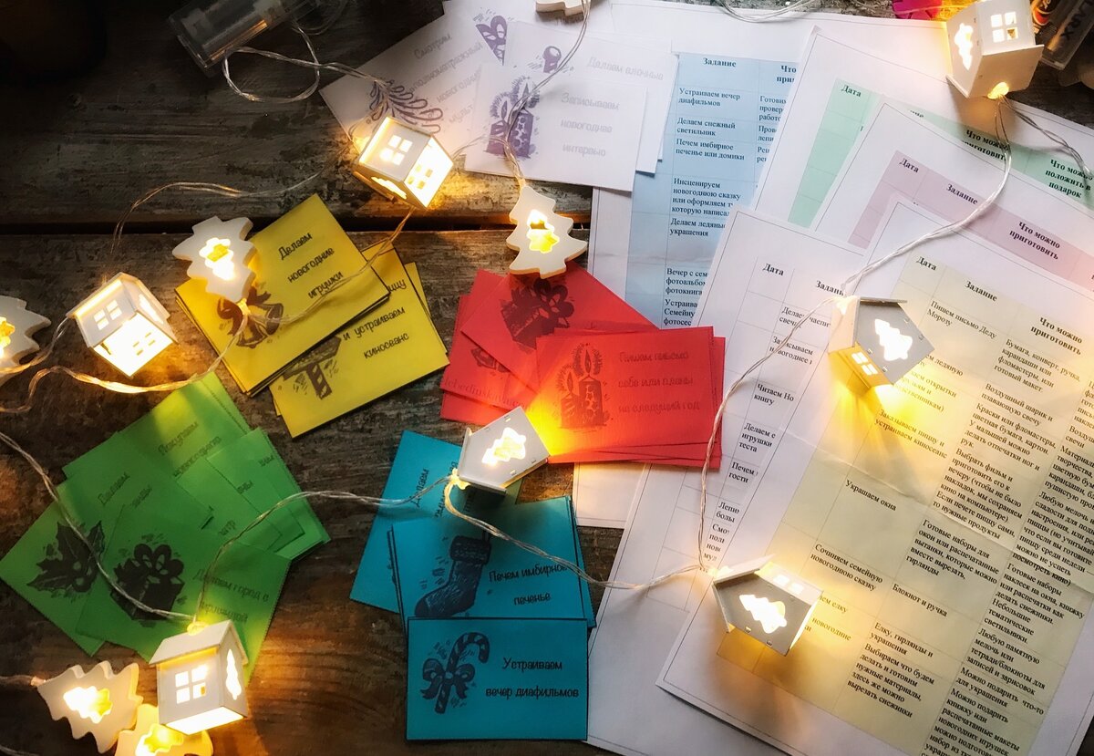 В первой статье (ссылку можно найти в конце) мы показали какие адвент календари бывают, где их можно заказать или купить, а какие можно сделать самим. Теперь, если у вас есть адвент календарь без заданий или вы делаете его сами - делимся заданиями для нашего адвент календаря 2021 года. Будем рады, если наши идеи помогут вам устроить праздник для детей. Я приготовила шаблоны с заданиями, которые можно распечатать на белой или цветной бумаге и шпаргалки для родителей. Рассказываю подробнее. Вот так выглядят распечатанные на цветной бумаге и разрезанные карточки, а рядом задания со списком материалов и подарков для родителей. Я приготовила 40 карточек, так чтобы все могли выбрать подходящие для себя. Мы начинаем наш адвент 1 декабря и он длится до 31 декабря, даже у нас будет запас. А если вы решите провести адвент в 14 или 10 дней перед Новым годом - выбора еще больше, а можно делать и несколько заданий в день, особенно в выходные. Сохранить шабл