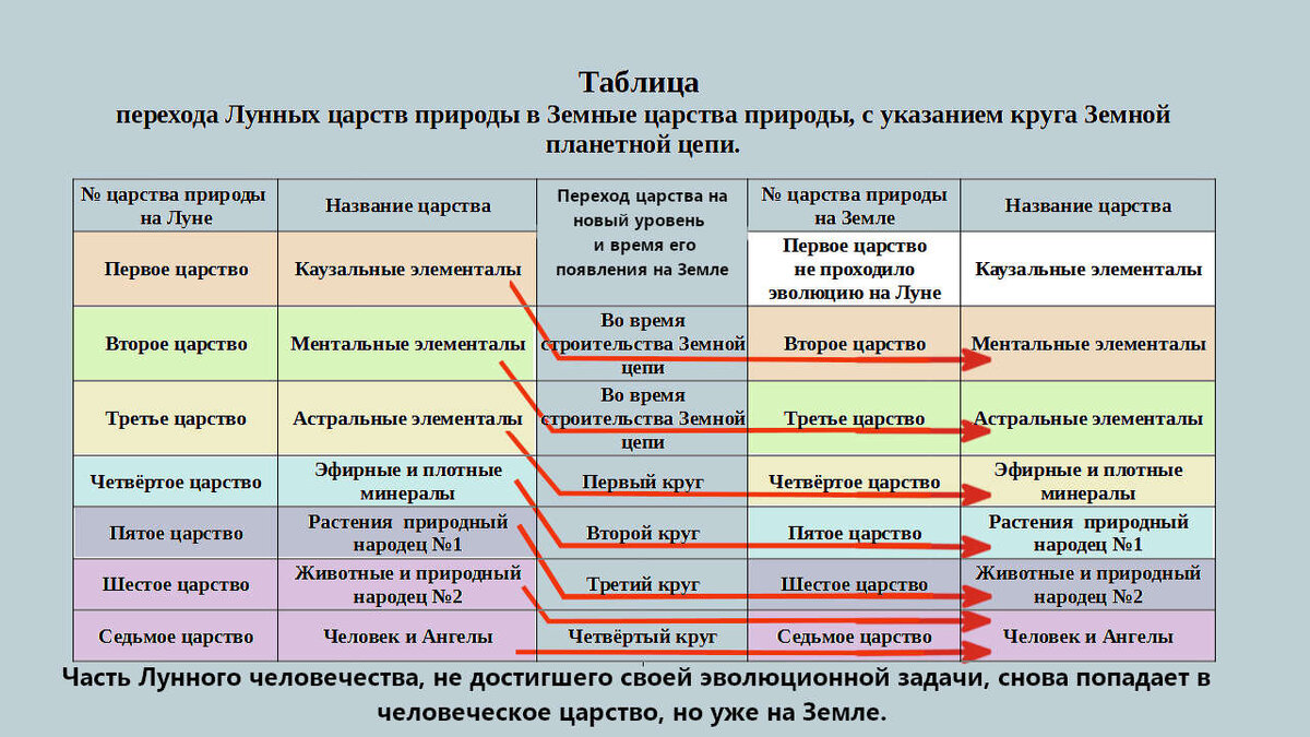 В теме №64 заявлялось, что примерные технических модели всех семи царств природы, появляются на Земной планетной цепи, ещё до того момента как эволюция начинает своё шествие по этой цепи планет. Откуда же взялись эти технические модели разных существ, в том числе и человека? С предыдущей планетной цепи, которая отработала свой положенный срок и сейчас находится в стадии разрушения, т.е. с Лунной планетной цепи. Эволюция не ограничивается пределами одной планеты, как это думает официальная наука или Западная религия, она переходит с планеты на планету, как изделие на конвейере движется от одного сборочного поста к другому. Проще говоря, Луна когда-то была такой же обитаемой как и Земля, на ней так же существовали три элементальных царства (каузальное, ментальное, астральное), минеральное царство, растения и природный народец №1, животные и природный народец №2, а так же Лунные люди и Лунные Ангелы. Когда Лунная планетная цепь достигла глубокой старости и стала непригодной для осуществления эволюционных процессов, то все достижения этой цепи (модели тел существ) были сохранены в Будхическом мире, как мы сохраняем файл на жёстком диске своего компьютера или смартфона. Когда Земная планетная цепь была построена и готова к заселению, с целью продолжения эволюции, существа под названием «Строители форм - тел» взяв из Будхического мира необходимую информацию, приступили к своей деятельности. Первыми на планете Земля, появились сразу все три элементальных царства (каузальное, ментальное, астральное) и царство эфирных и плотных минералов, до этого развивавшихся на Луне. Вторым на планете появилось царство растений и природного народца №1, а третьими по счёту животные и природный народец №2. Позже всех на планете появились люди и Ангелы. Это вовсе не означает, что все люди ранее обитавшие на Луне, переселились на планету Земля, дело обстоит немного сложнее. У каждого царства природы есть своя эволюционная задача, достигнув которую, существа принадлежащие к этому царству, переходят в длительное состояние покоя и отдыха, а проснувшись продолжают эволюцию в новом царстве или на более высокой ступени. То человечество, что обитало на Луне, в период её функционирования, достигло своей задачи и перешло на вышестоящий уровень сверхлюдей. Только та часть Лунного человечества, что не до конца выполнило эволюционную задачу «как второгодники в школе» были обязаны снова пройти человеческую ступень эволюции, но уже на Земле. С другой стороны, ряды Земного человечества были пополнены из числа Лунных животных, которые при переходе на новую планетную цепь поднялись на одну эволюционную ступень выше, т.е. из животного в человеческое царство (смотри Тема №63). При переселении существа обитавшие на Луне как растения, на нашей Земной цепи перешли на вышестоящую ступень и образовали царство Земных животных. Те существ, что на Лунной цепи эволюционировали как эфирные и плотные минералы, при переходе на Земную цепь, превратились в Земные растения и.т.д. по аналогии.