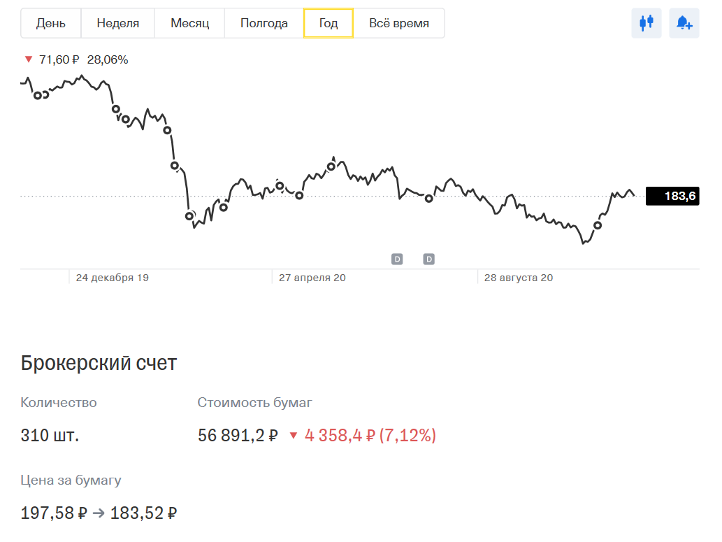Просадка по данным акциям доходила до 40%, но я понимал, что нужно докупать и докупать, и уменьшать среднюю цену покупки, которая в итоге стала 197р, как видно на скриншоте выше.