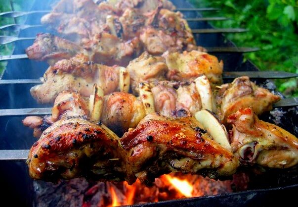 Нанизываем шашлык на шампура или на решетку и запекаем над раскаленными углями. Несколько раз переворачиваем во время запекания до получения готового состояния.