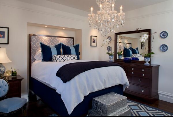 Для спальни в квартире, которая ограничена горизонтальным пространством (тумбочка здесь служит туалетным столиком и комодом), люстра-прикроватная лампа - творческое решение. Конечно, в этой конкретной спальне она может быть очень тесной, но с изголовьем до потолка и элегантной цветовой палитрой эта комната излучает только просторную роскошь.