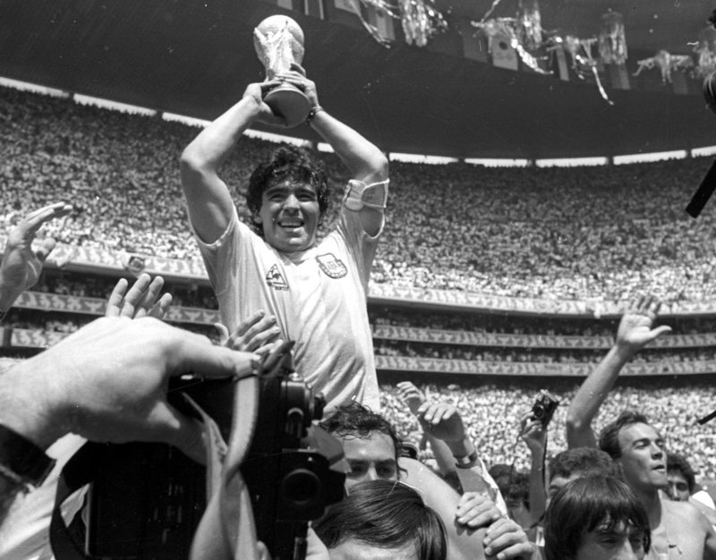 Марадона с Кубком мира после победы на ЧМ-1986, где он был признан лучшим игроком турнира.