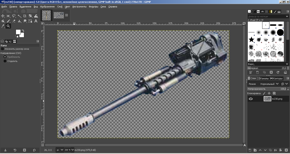 Раз заморочился нужно делать, сейчас у меня вертолет "апач", я решил что он будет носить 2 единицы вооружения, для начала игры достаточно, установить на него 1 пушку, взял его базовое орудие 30 миллиметровую пушку М230, нашел картинку в интернете, подредактировал и вот какая пушка у меня получилась:
