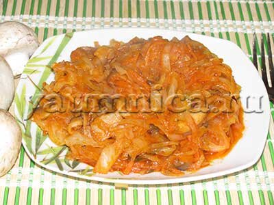 Я же хочу вам предложить очень вкусный рецепт тушеной капусты с грибами. На приготовление этого блюда уйдет не так много времени, а получится оно очень вкусным.