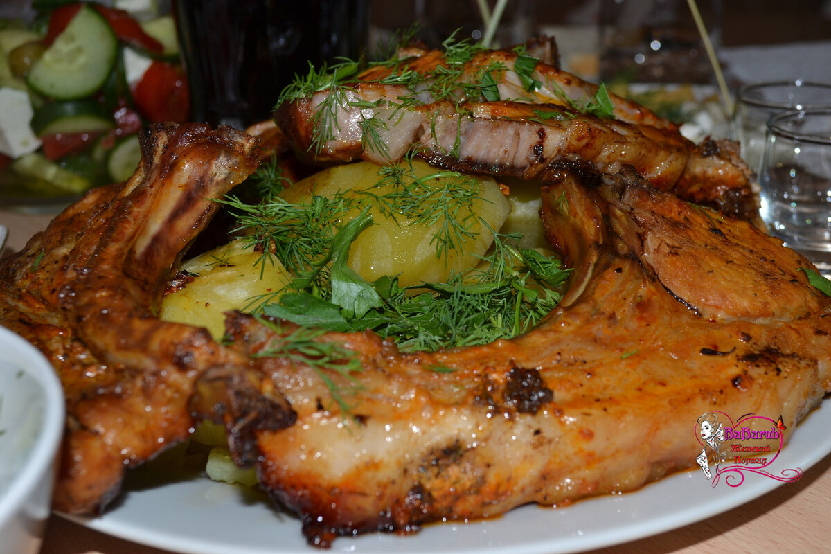 Затем выкладываем замаринованное мясо на противень, смазанный маслом и оправляем в духовку на 1 - 1,5 часа, в зависимости от толщины мяса - при t180C.