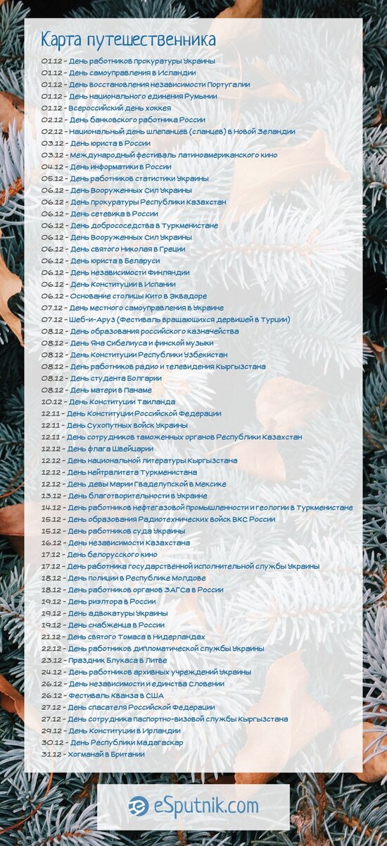 Поскольку декабрьские праздники проходят во всём мире, здорово было бы узнать немного больше о разных традициях и культурах по всему миру. Не обязательно отправляться в путешествие, чтобы узнать какие интересные торжества будут проходить в мире в этом месяце.