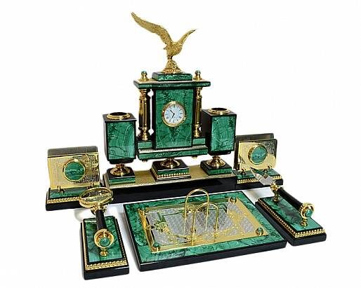 Наборы производятся из разных материалов, таких как малахит, мрамор, лазурит, яшма, бронза, латунь, долерит и кахолонг.