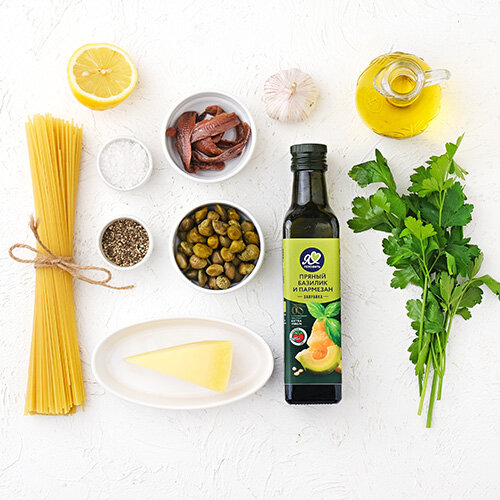2. Пока готовится паста, порубите анчоусы и чеснок, мелко нарежьте петрушку, цедру натрите на мелкой терке. Разогрейте в большой сковороде 3 ст. л. оливкового масла и добавьте чеснок, анчоусы и каперсы. Готовьте, часто помешивая, 4 мин.