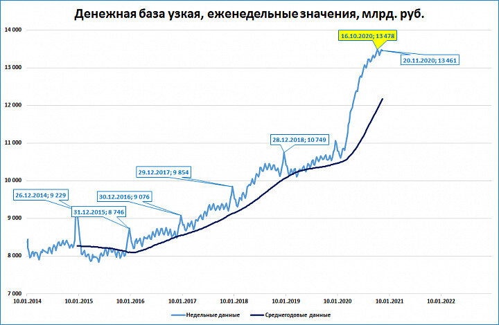 Узкую денежную базу (в отличие от других денежных показателей) мы можем наблюдать в еженедельном режиме.