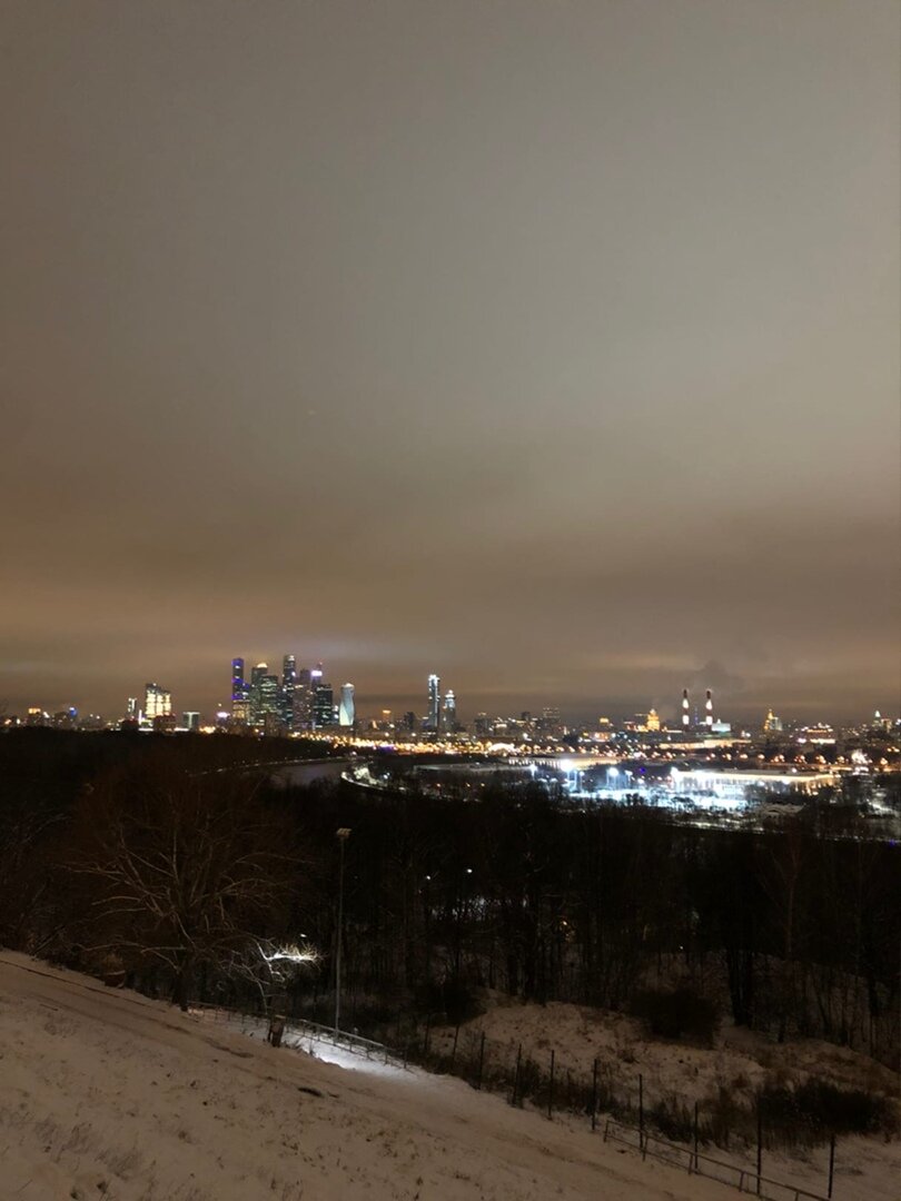 Заключалась она в пешей прогулке вдоль набережной от парка Горького до Воробьевых гор, когда с неба идет белыми хлопьями снег, а рядом светят фонари и течет Москва река.