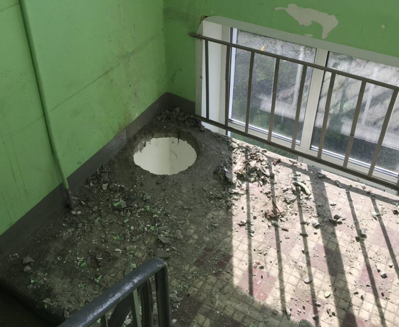 Ночью в одной из многоэтажек Москвы неизвестные украли мусоропровод. Жильцы подъезда проснувшись утром обнаружили, что кто-то срезал трубу мусоропровода и контейнеры на протяжении 12 этажей.