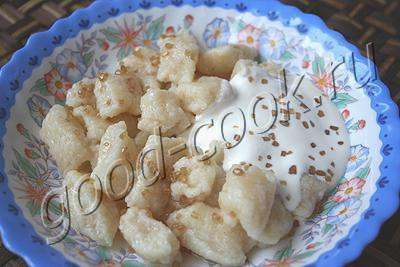 Подавать горячими со сметаной или посыпав поджаренными на сливочном масле толчеными сухарями.