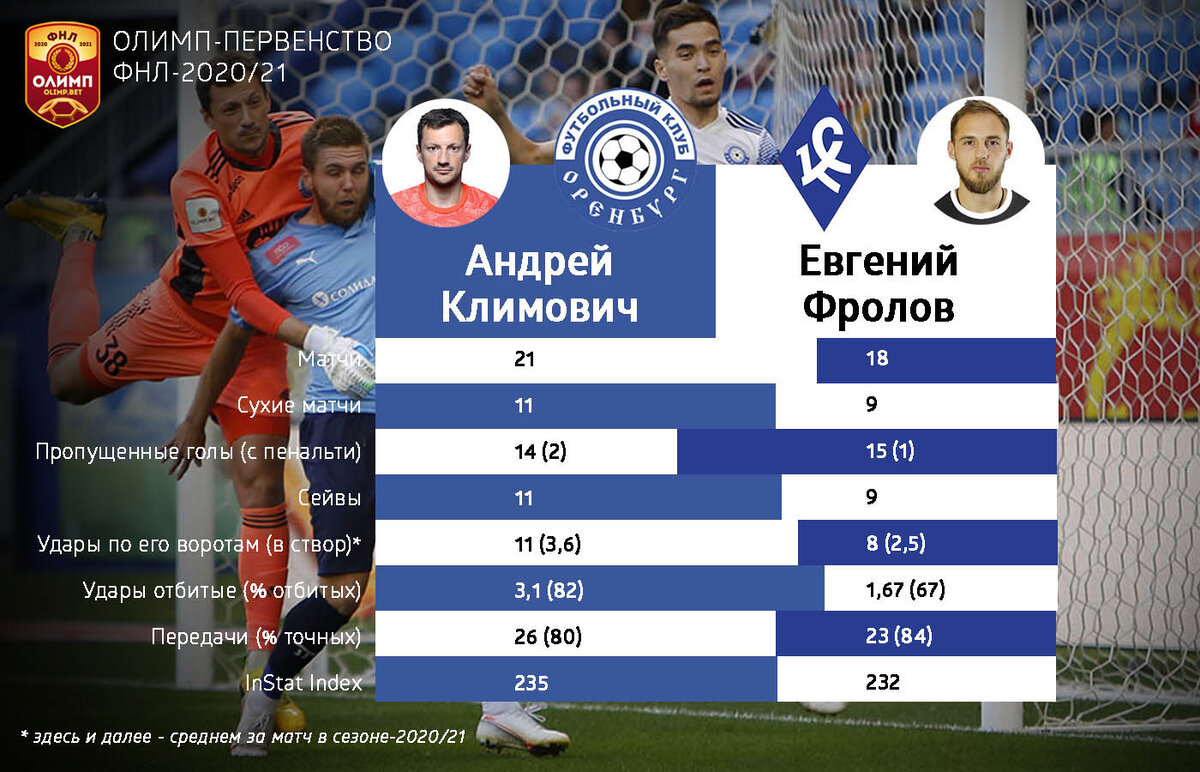 А вот и сравнение статистики главных стражей ворот предстоящих соперников - Андрея Климовича и Евгения Фролова. Будем надеяться, что Евгений сможет принять участие в этой важной игре. Напомним, что совсем недавно, в игре в Хабаровске он был заменён во время первого тайма из-за повреждения, а в последней игре с "Чайкой" участие не принимал. Но сейчас готовится к матчу с "Оренбургом" в общей