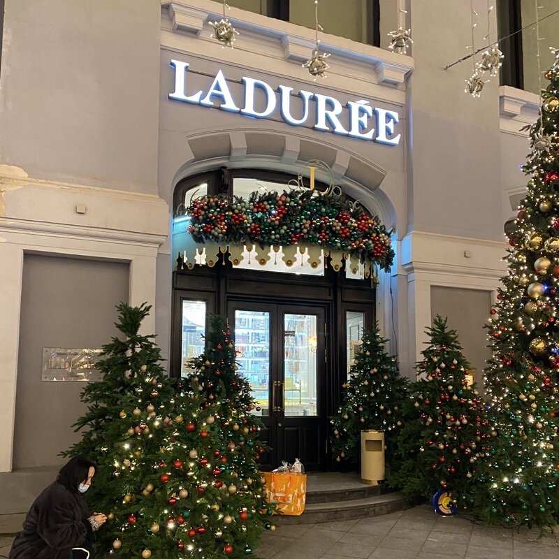 Французская кондитерская Laduree a-la Russe, облюбовавшая первый этаж исторического здания еще в 2017 году, завлекала народ белой вывеской на зарубежном языке и елками в шариках у входа.