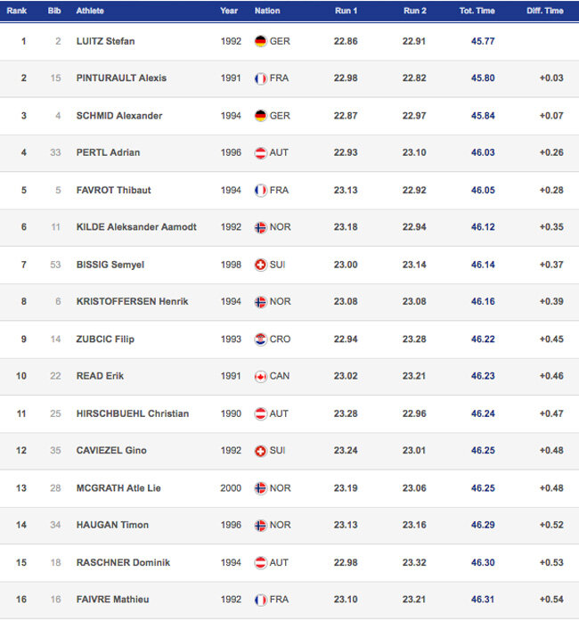 Всего 3 сотых секунды ему проиграл опытный француз Алекси Пинтуро. На третьем месте – еще один представитель Германии Александр Шмид (+0.07). Подающий надежды австриец Адриан Пертль уступил лидеру 26 сотых, это четвертая позиция. Дальше с очень плотными результатами идут Тибо Фавро (Франция), Александр Амодт Кильде (Норвегия), Земиэль Биссиг и норвежец Хенрик Кристофферсен, замыкающий первую восьмерку.