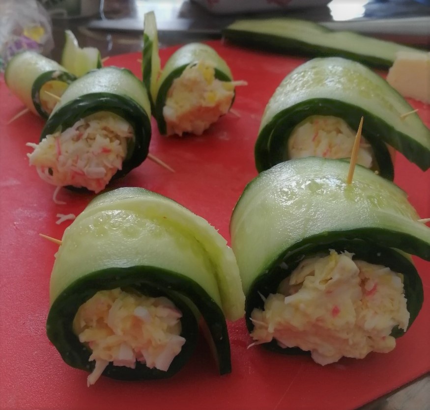 Для начала нужно нарезать вдоль огурцы, ибо они будут придерживать все внутренние продукты. Нарезав вдоль огурцы переходим к сыру, который нужно будет натереть. Далее разрезаем курицу, крабовое мясо или колбасу на маленькие кубики, это и будет основой нашего блюда. Отвариваем яйца, берём белок и крошим его. Далее берем огурец и нужно его свернуть, положив внутрь все наши ингредиенты. Для того, чтобы не разваливалась закуска вонзаем зубочистку. Получаются домашние русские роллы, мы прозвали их именно так. Вкус у них довольно таки приятный, а на столе они надолго не задерживаются. Попробуйте приготовить и делитесь фото, будем ждать!(снизу приложили фотографию нашего блюда, как должно оно выглядеть).