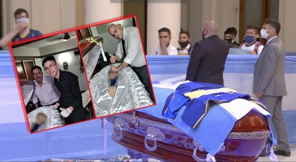 В сети появились снимки трех мужчин, сфотографировавших себя над открытым гробом Диего Марадоны. Известно, что один из них - Диего Молина - сотрудник похоронного бюро, арендованного семьей погибшего футболиста. Фактически, он уже был бывшим сотрудником, потому что его только что уволили.