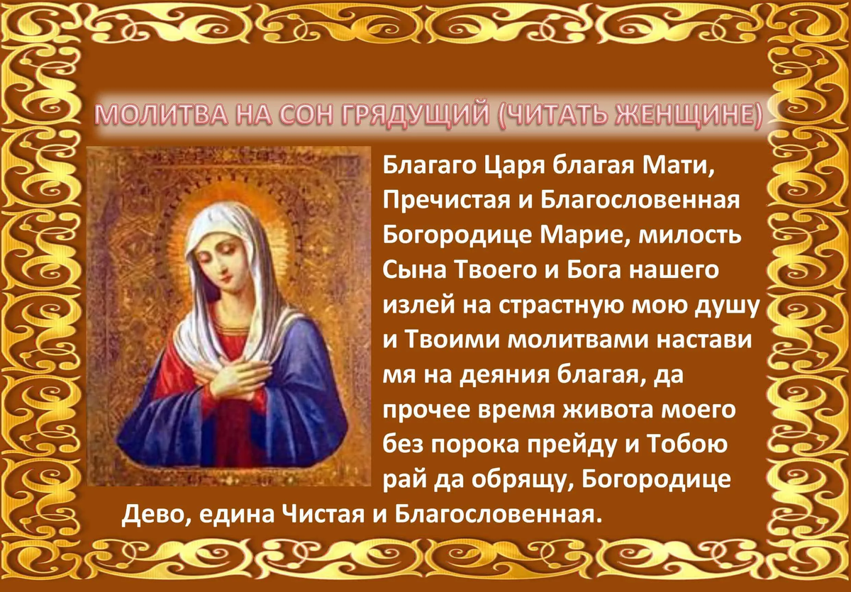 И даждь ми, Господи, в нощи сей сон прейти в мире, да востав от смиреннаго ми ложа, благоугожду пресвятому имени Твоему, во вся дни живота моего, и поперу борющия мя враги плотския и безплотныя. И избави мя, Господи, от помышлений суетных, оскверняющих мя, и похотей лукавых. Яко Твое есть царство, и сила и слава, Отца и Сына и Святаго Духа, ныне и присно и во веки веков. Аминь.