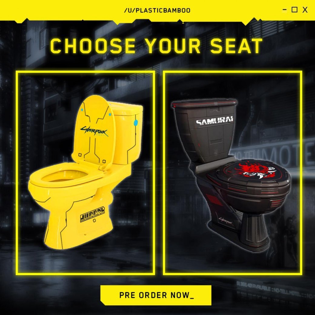 Свой дизайн пользователь под ником PlasticBamboo представил два дня назад. Работа оформлена в фирменном стиле рекламы Cyberpunk 2077 и представляет два унитаза разных цветов.