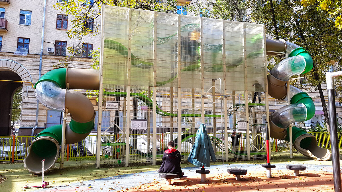 Дворы в центре буквально соревнуются в крутости. Вот и ещё один достойный экземпляр появился в Басманном районе в конце 2019 года. Можно сказать, крутой парк в усеченном варианте. Здесь всё как у взрослых: батут, балансир, качели разных видов, песочница под навесом. Activity wall, она же "хомячья клетка", высоченная, но абсолютно безопасная. Дети от неё в восторге, от мелких до школьников.