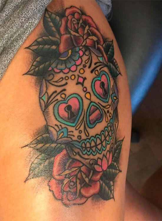 В Мексике и некоторых других странах Центральной Америки существует традиция отмечать День Мертвых, когда люди не скорбят, а наоборот устраивают праздник в честь умерших родных. Считается, что в этот день их души возвращаются на землю. Одним из символов этого события является Сахарный череп или Калавера, который олицетворяет все приятные воспоминания о потерянном близком человеке. Эскизы татуировок мексиканского черепа очень яркие, украшаются цветами, листьями и узорами.